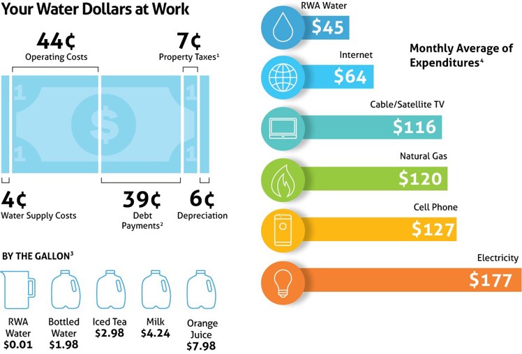 At the Regional Water Authority (RWA), our mission is to provide customers with high-quality water and services at a reasonable cost while promoting the preservation of watershed lands and aquifers. We deliver this high-quality water directly to your tap around the clock for about a penny per gallon. That’s a small price to have a service so essential available at your fingertips at any time of day or night. Your water bill is made up of a service charge and a usage charge. The service charge pays for the fixed costs of providing water to your home, so water is there any time you turn on a faucet. The usage charge varies depending on how much water you have used in the preceding billing period. If you use less water, your usage charge will be lower. If you use more water, your usage charge will be higher. When you turn on the tap, it’s easy to see what your water bill buys. What’s not as easy to see is what it takes for us to bring water straight to your home. It takes running four state-of-the-art treatment plants, maintaining over 1,700 miles of underground pipes, managing landholdings of almost 28,000 acres of watershed land, conducting over 104,000 drinking water tests per year, safely operating a myriad of equipment, and a team of dedicated, skilled employees working 24/7 to produce and deliver abundant, reliable, high-quality water. All of this is included in your service charge! Water is one of the most economical services you pay for, and you get a lot of value for your money.